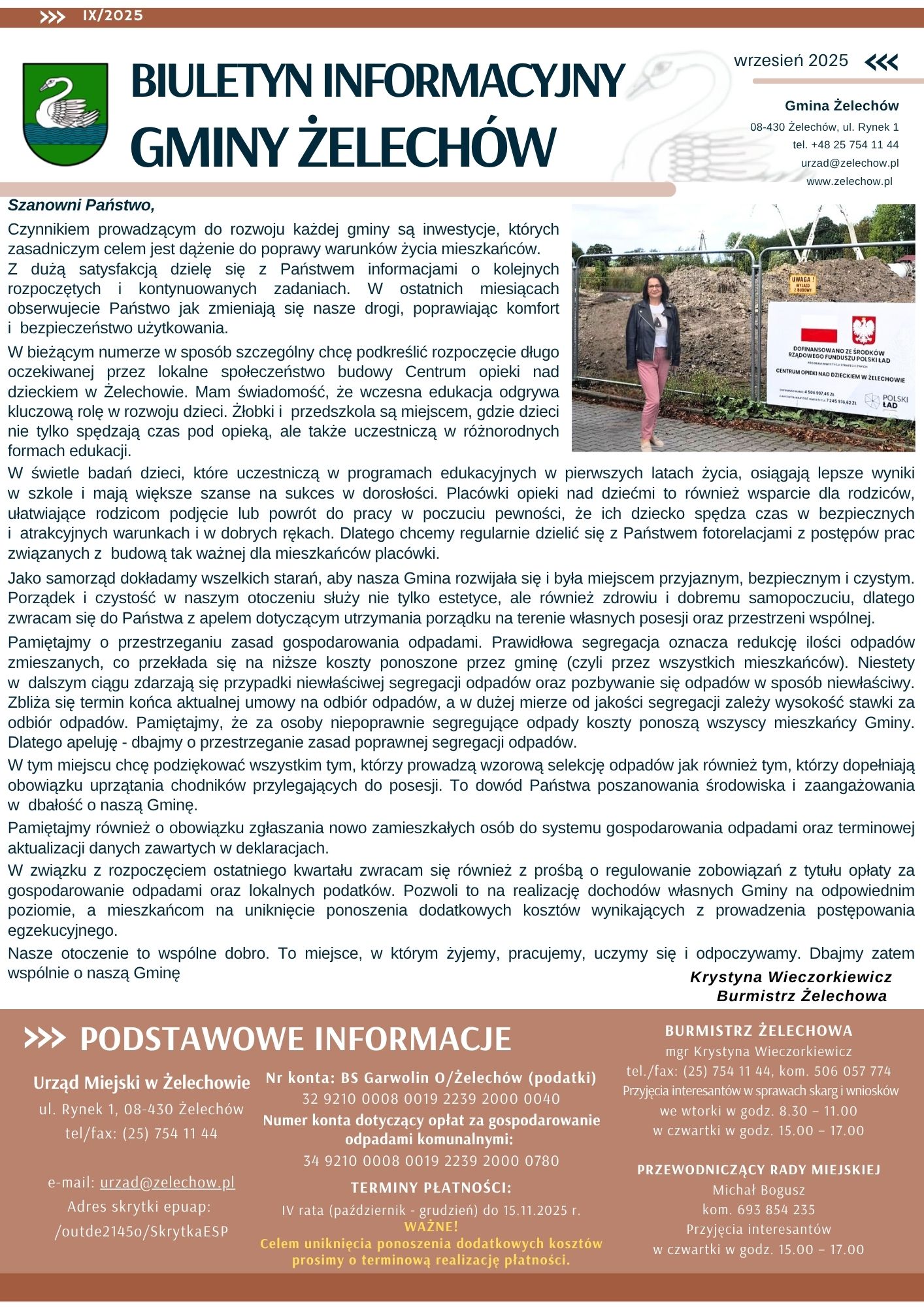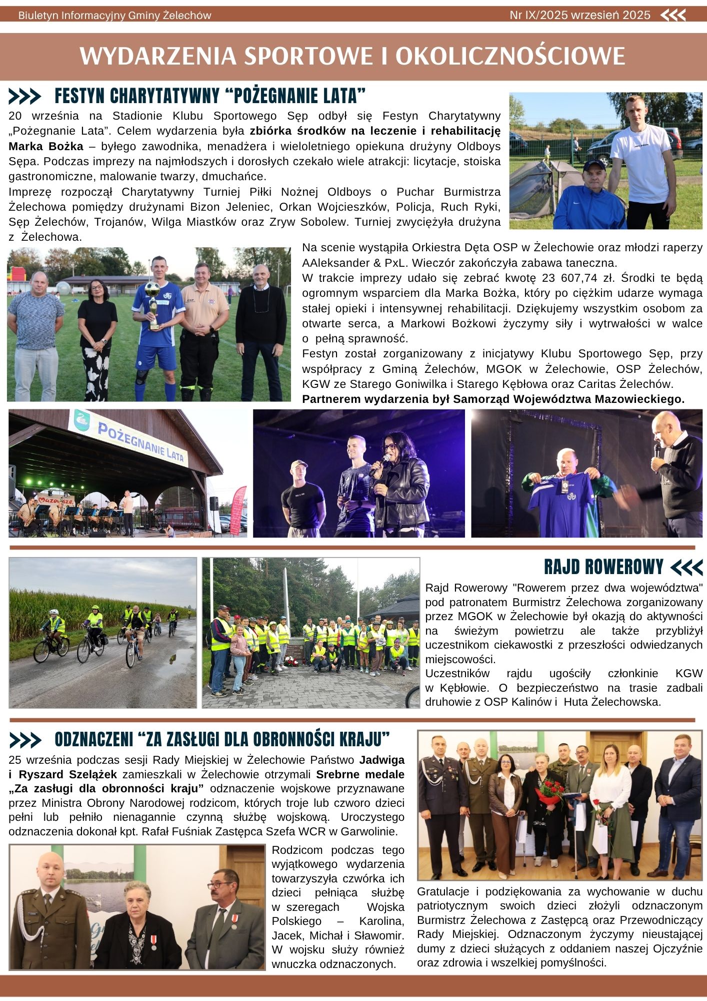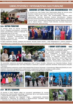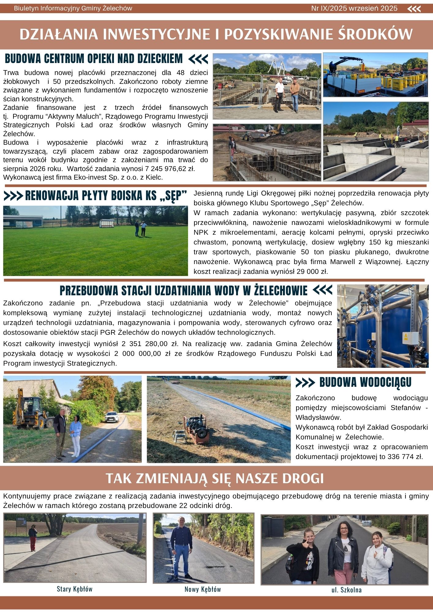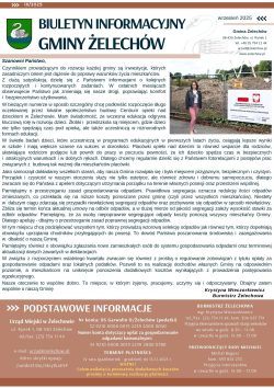 W Biuletynie Informacyjnym Gminy Żelechów za miesiąc wrzesień znajdziecie Państwo informacje wraz z dokumentacją fotograficzną dotyczące realizowanych w ostatnim okresie zadań inwestycyjnych oraz relacje z wydarzeń kulturalnych, sportowych i okolicznościowych.