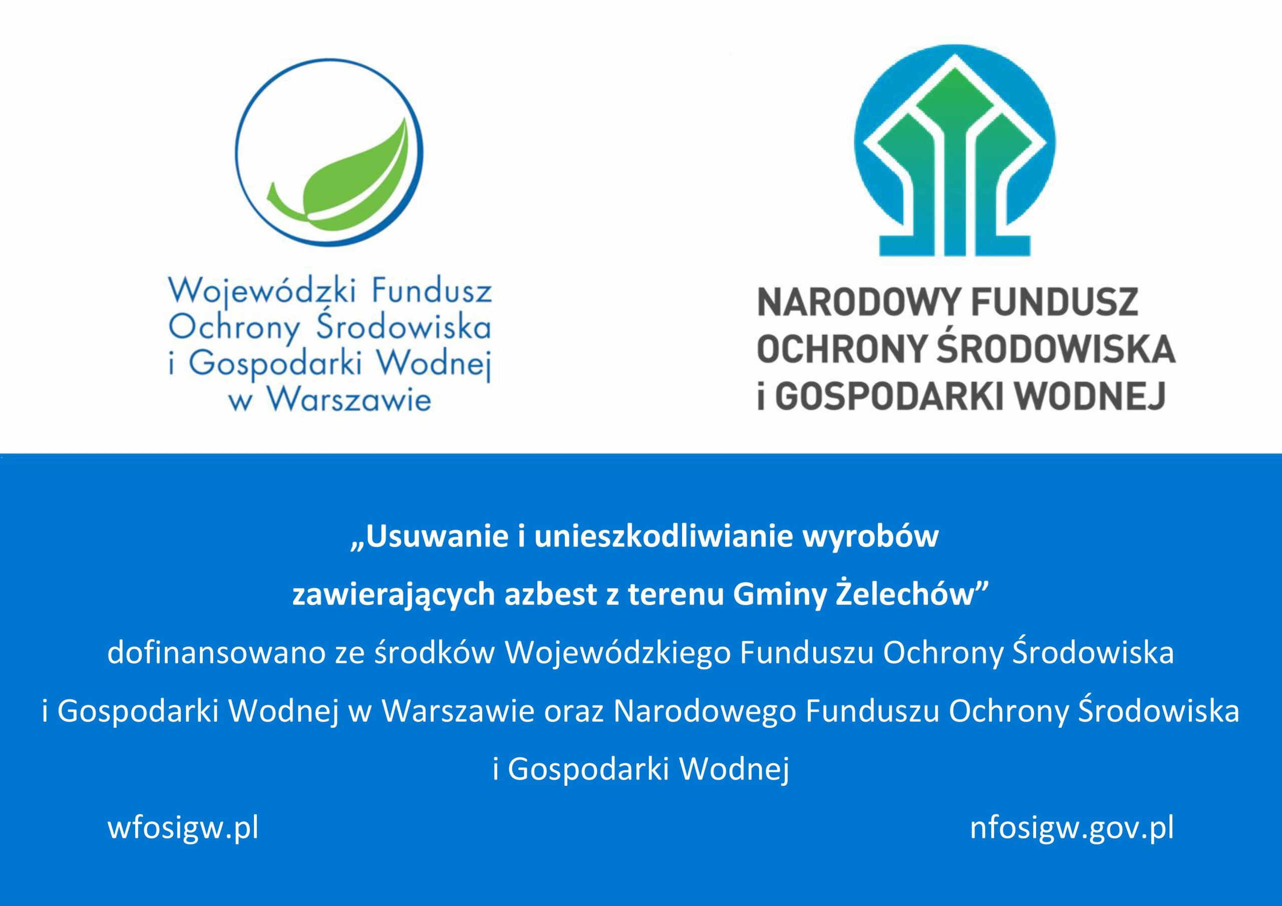 Zadanie pn. „Usuwanie wyrobów zawierających azbest z terenu Gminy Żelechów” zostało dofinansowane ze środków Wojewódzkiego Funduszu Ochrony Środowiska i Gospodarki Wodnej w Warszawie oraz Narodowego Funduszu Ochrony Środowiska i Gospodarki Wodnej.