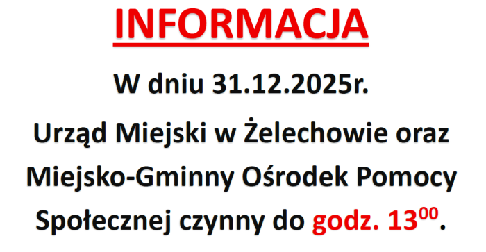 W dniu 31.12.2025r. Urząd Miejski w Żelechowie oraz Miejsko-Gminny Ośrodek Pomocy Społecznej w Żelechowie czynny do godziny 13:00.