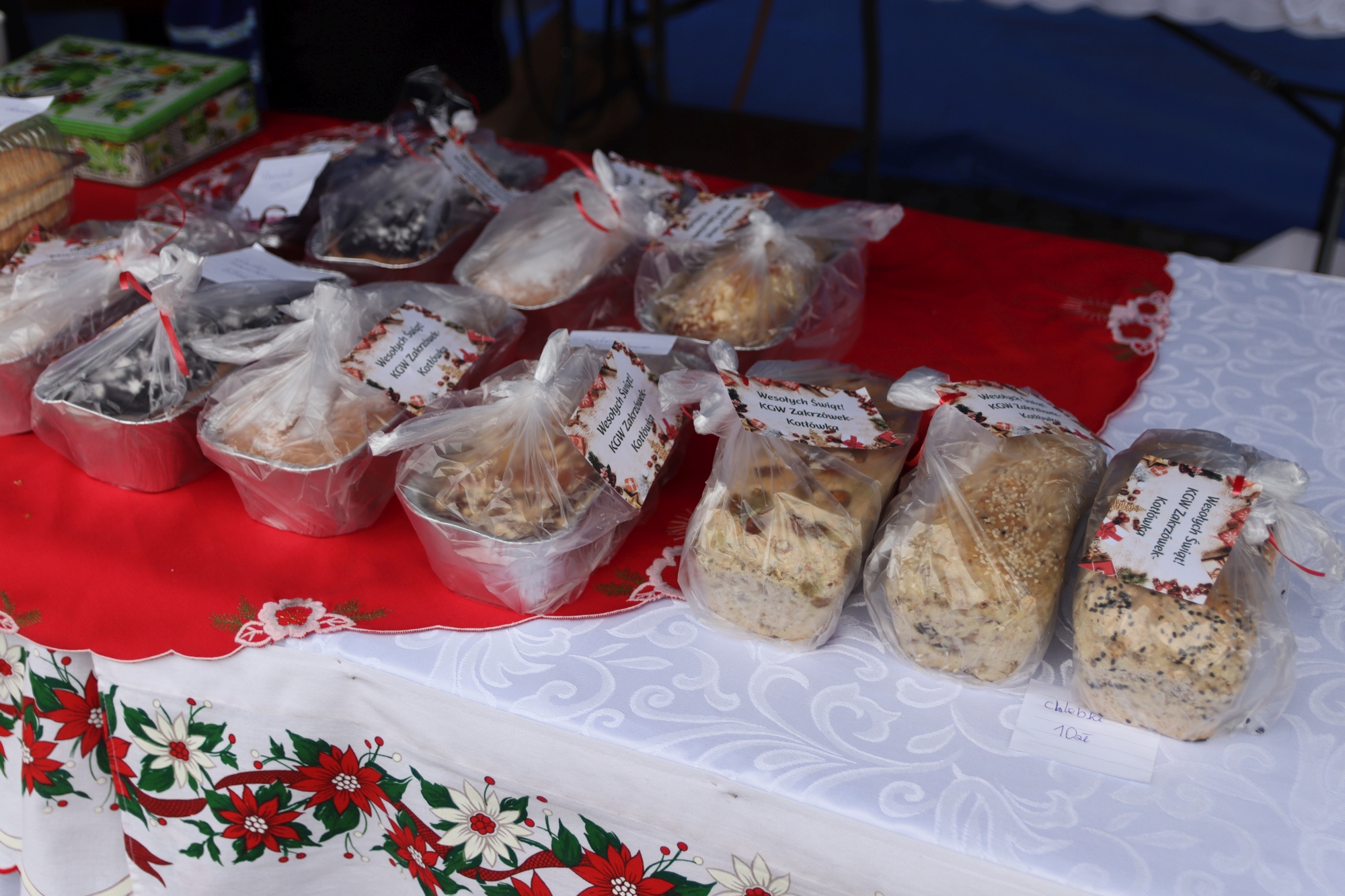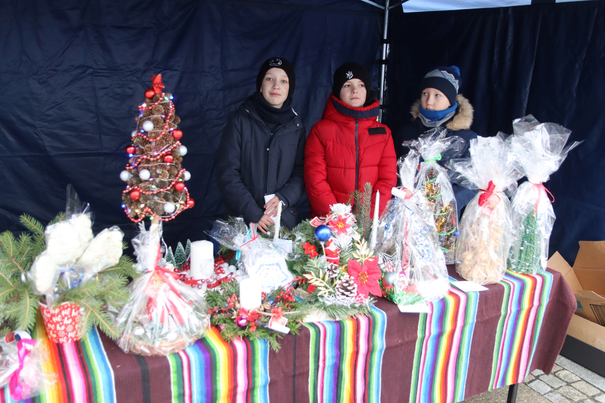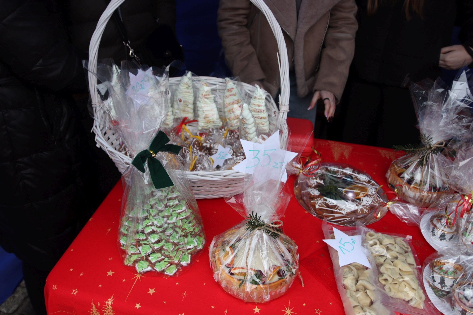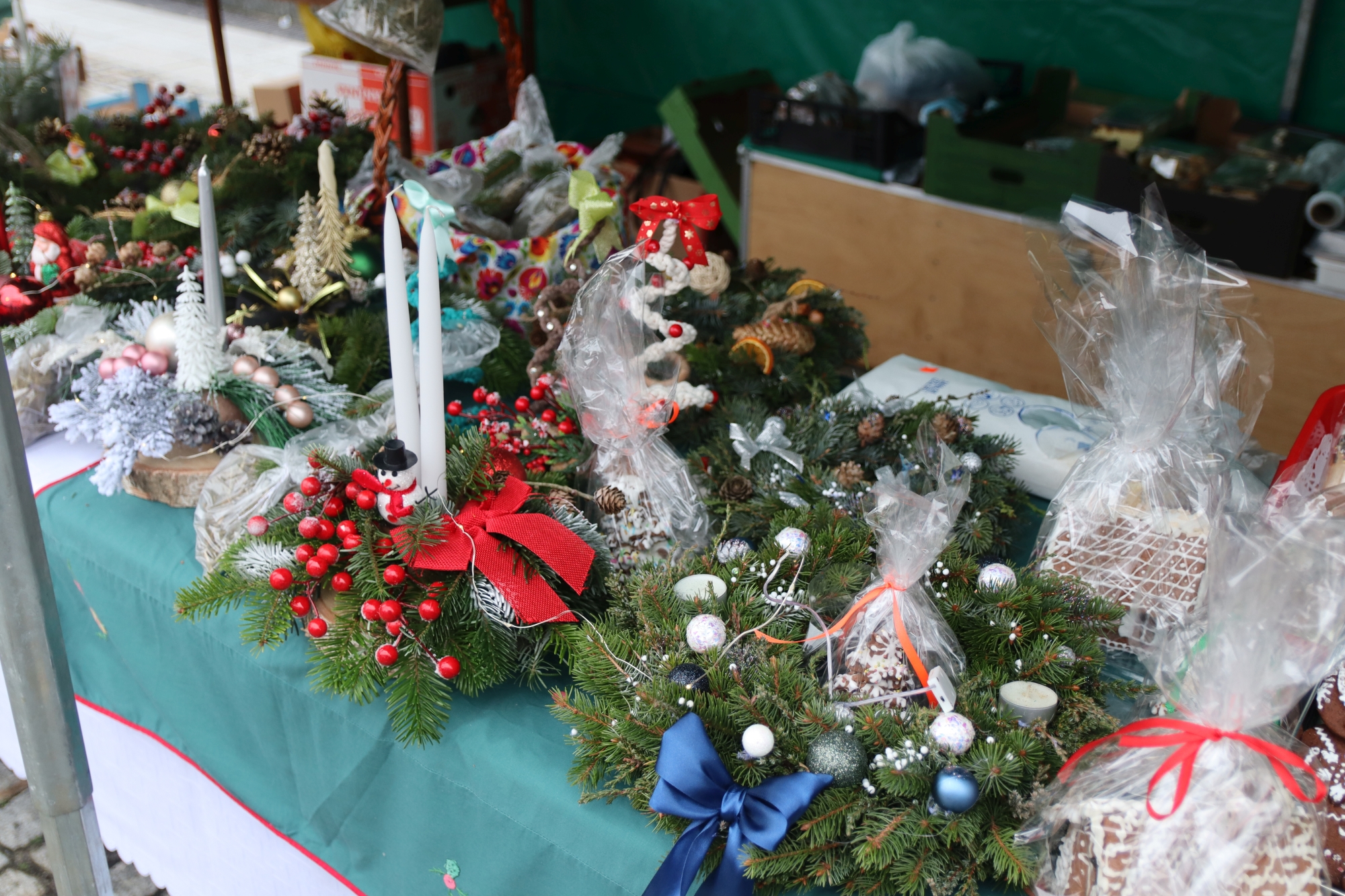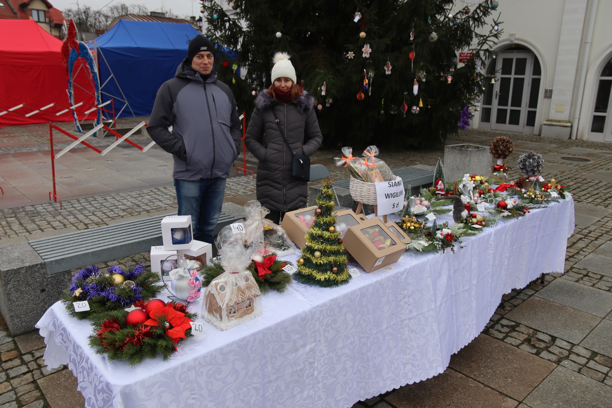 Licznie zgromadzeni mieszkańcy mieli możliwość nabycia różnorodnych wyrobów rękodzielniczych, takich jak stroiki, wianki, ozdoby choinkowe oraz kartki świąteczne. Ponadto na stoiskach można było znaleźć tradycyjne potrawy: pierogi z kapustą i grzybami, uszka, kapustę wigilijną, pasztety świąteczne, domowy chleb, zakwas z kiszonych buraków, olej lniany oraz słodkości w postaci ciast, pierniczków i chatek z piernika. Było również sianko pod wigilijny obrus oraz świąteczna jemioła. Podczas kiermaszu pracownicy MGOK i Biblioteki Publicznej prowadzili jubileuszową loterię, w której można było wylosować m.in. gminne gadżety. Na dzieci czekała bezpłatna atrakcja w postaci ruchomych sań Mikołaja, które unosiły się i kołysały. Dużym zainteresowaniem najmłodszych cieszyły się również zimowe animacje z nagrodami.