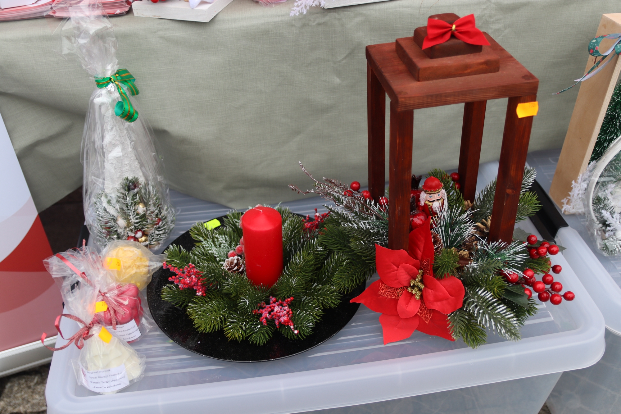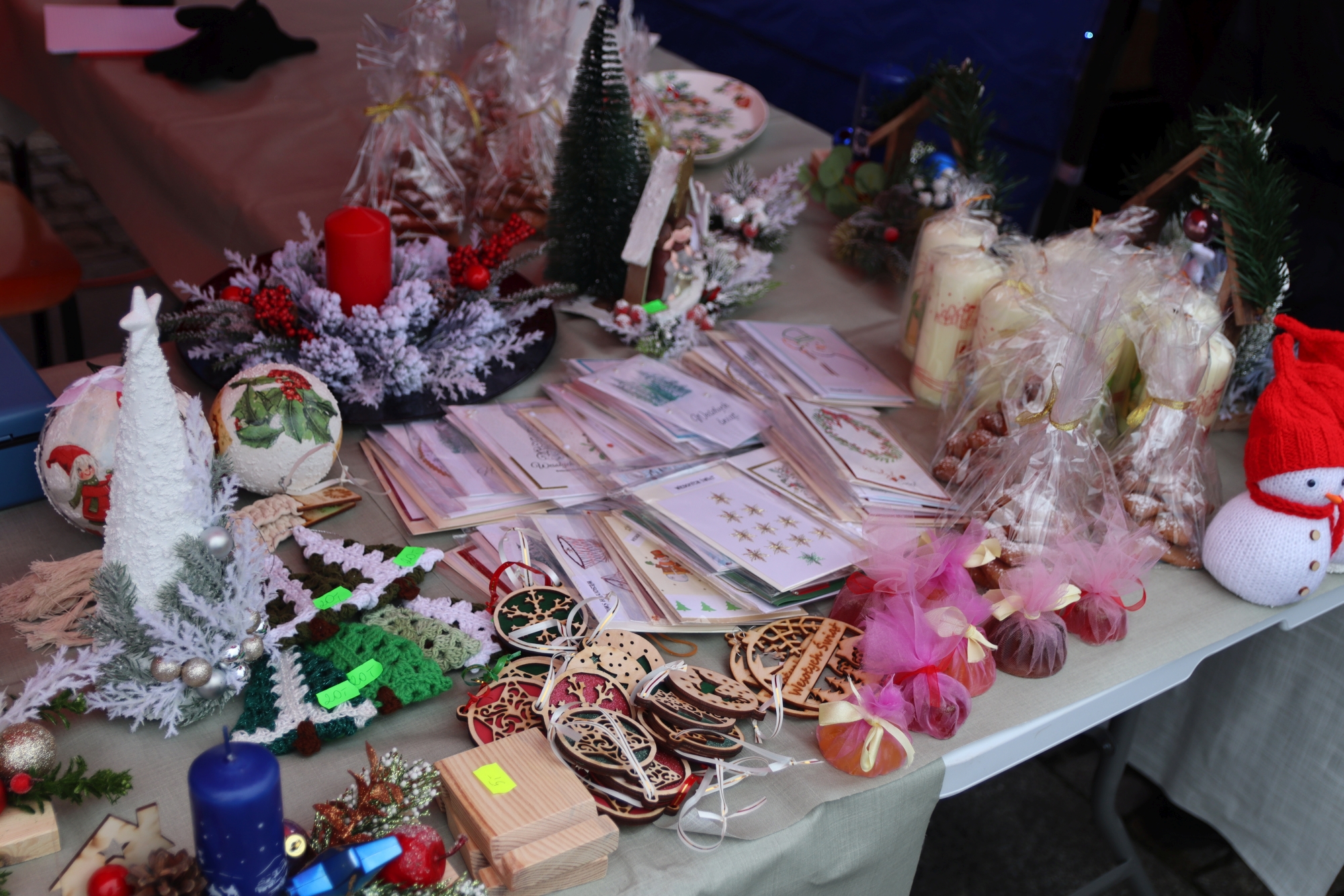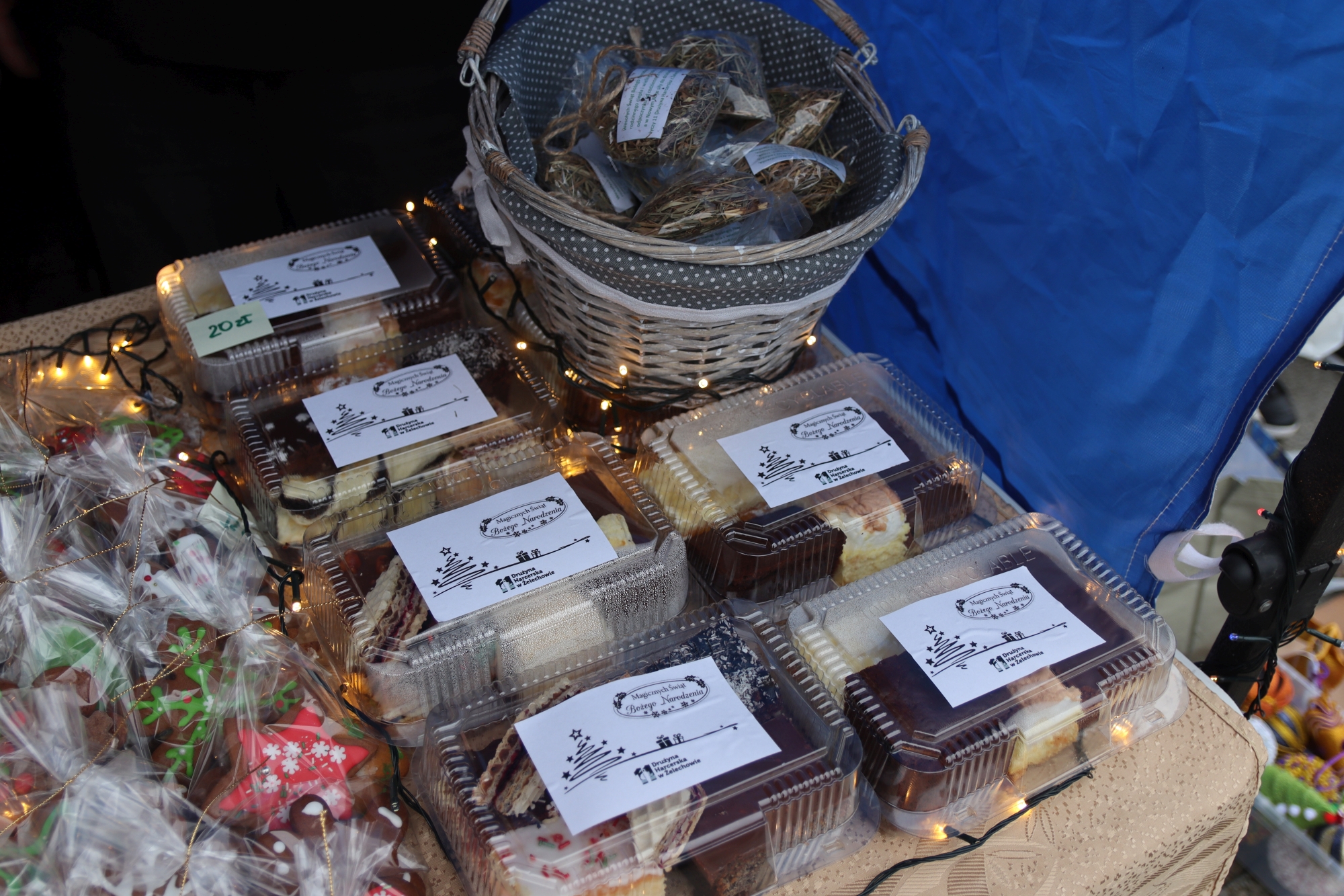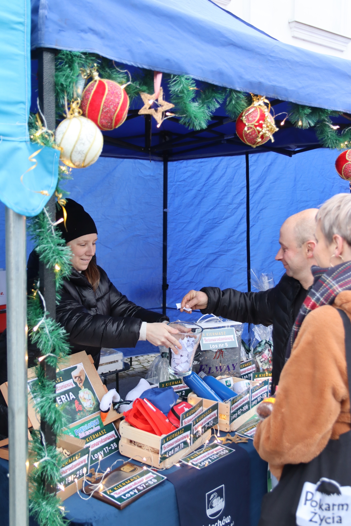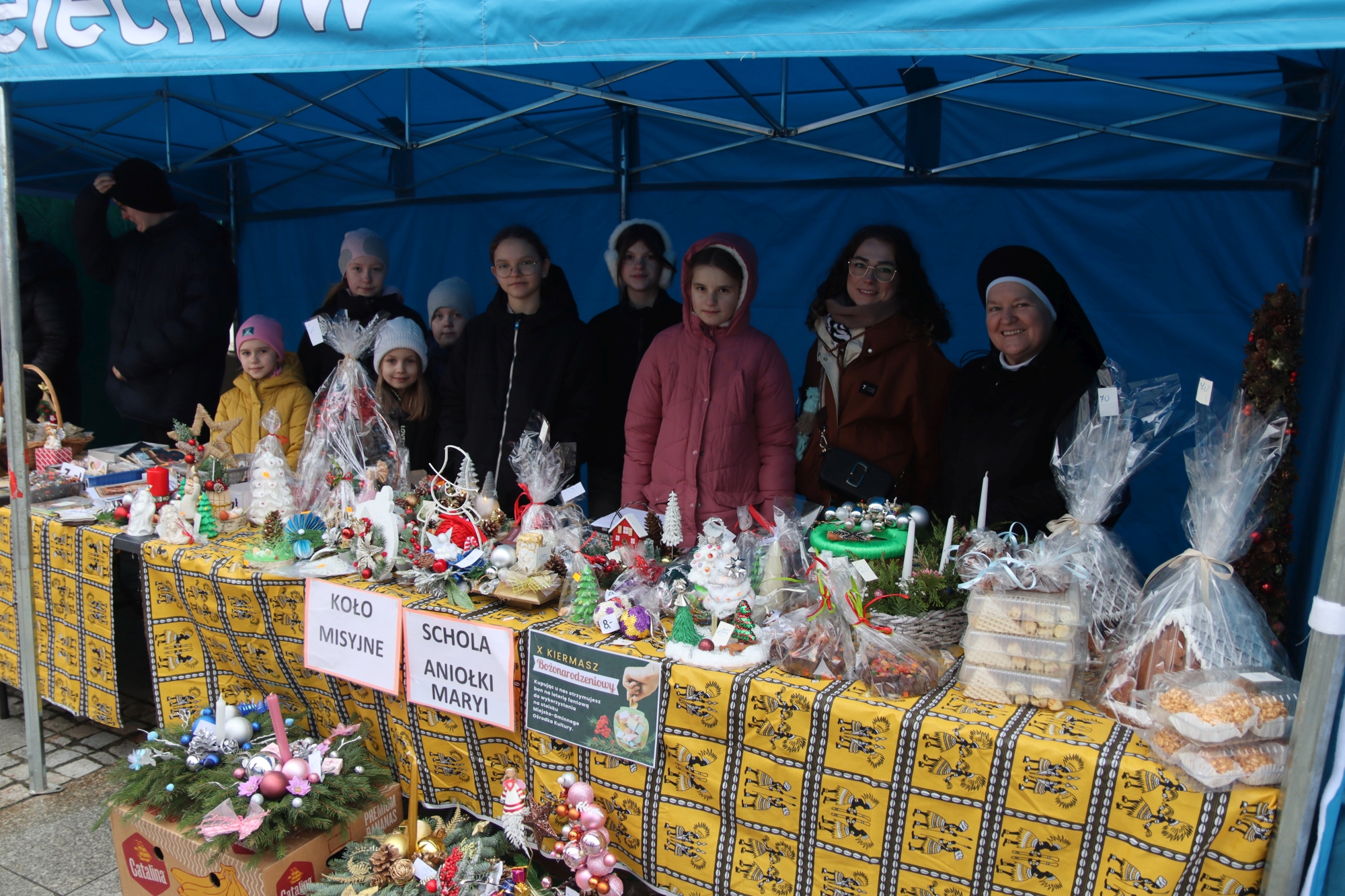 Licznie zgromadzeni mieszkańcy mieli możliwość nabycia różnorodnych wyrobów rękodzielniczych, takich jak stroiki, wianki, ozdoby choinkowe oraz kartki świąteczne. Ponadto na stoiskach można było znaleźć tradycyjne potrawy: pierogi z kapustą i grzybami, uszka, kapustę wigilijną, pasztety świąteczne, domowy chleb, zakwas z kiszonych buraków, olej lniany oraz słodkości w postaci ciast, pierniczków i chatek z piernika. Było również sianko pod wigilijny obrus oraz świąteczna jemioła. Podczas kiermaszu pracownicy MGOK i Biblioteki Publicznej prowadzili jubileuszową loterię, w której można było wylosować m.in. gminne gadżety. Na dzieci czekała bezpłatna atrakcja w postaci ruchomych sań Mikołaja, które unosiły się i kołysały. Dużym zainteresowaniem najmłodszych cieszyły się również zimowe animacje z nagrodami.