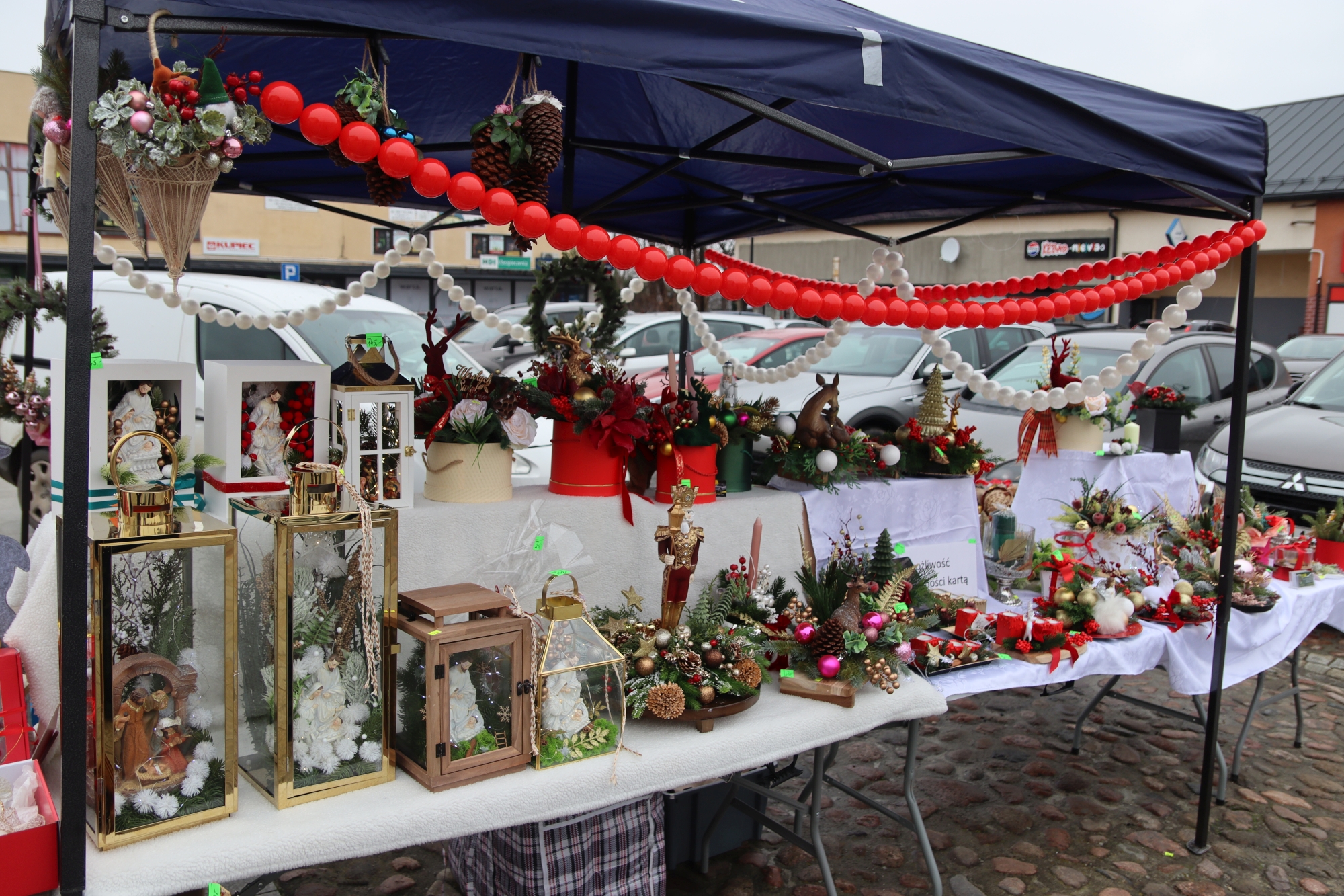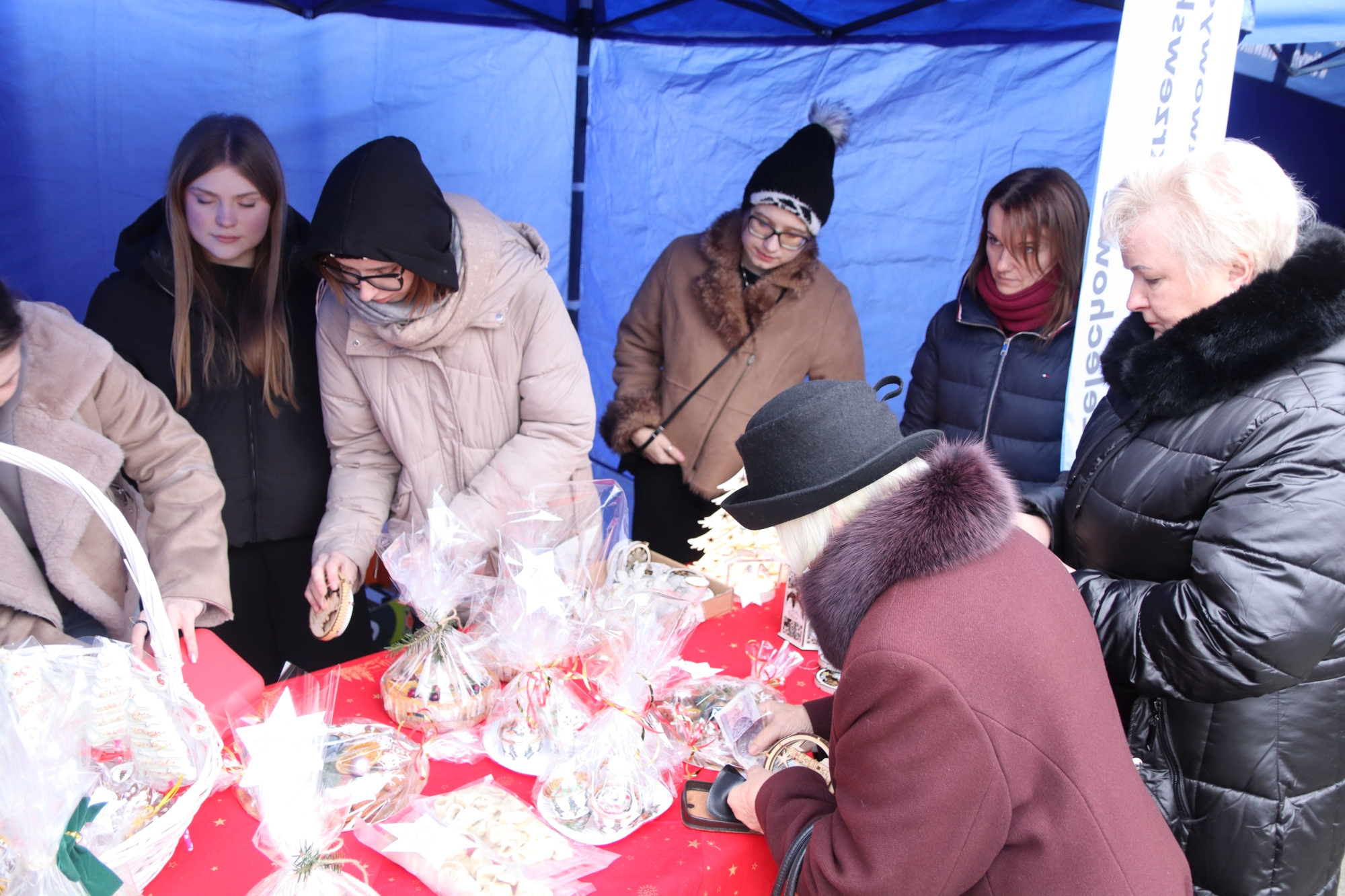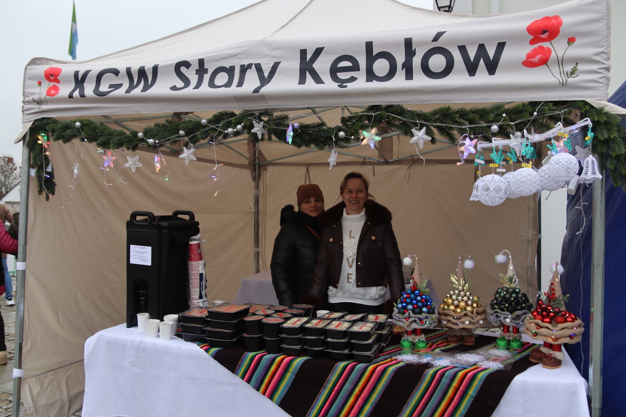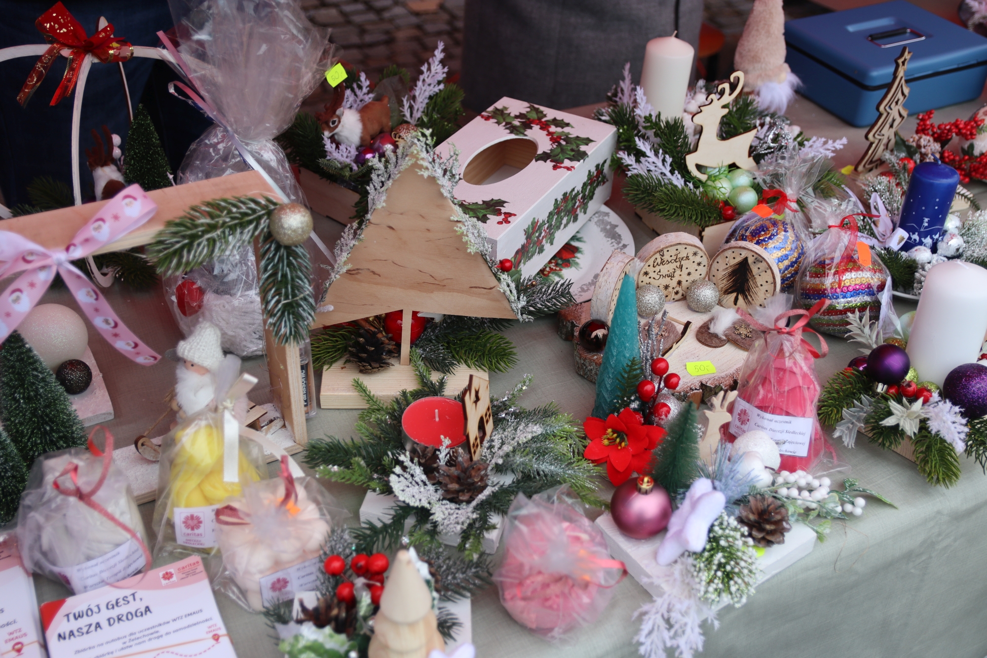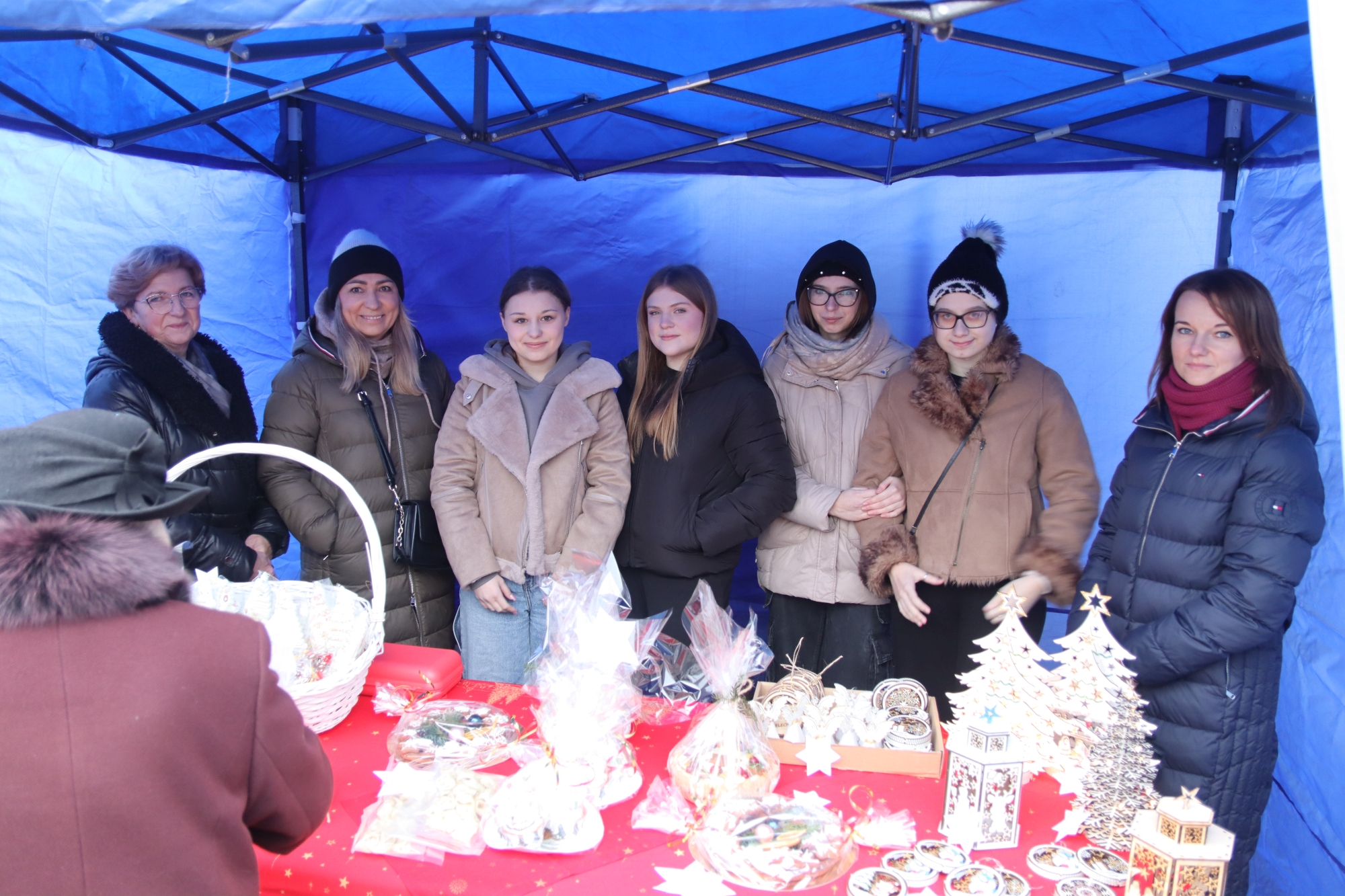 Licznie zgromadzeni mieszkańcy mieli możliwość nabycia różnorodnych wyrobów rękodzielniczych, takich jak stroiki, wianki, ozdoby choinkowe oraz kartki świąteczne. Ponadto na stoiskach można było znaleźć tradycyjne potrawy: pierogi z kapustą i grzybami, uszka, kapustę wigilijną, pasztety świąteczne, domowy chleb, zakwas z kiszonych buraków, olej lniany oraz słodkości w postaci ciast, pierniczków i chatek z piernika. Było również sianko pod wigilijny obrus oraz świąteczna jemioła. Podczas kiermaszu pracownicy MGOK i Biblioteki Publicznej prowadzili jubileuszową loterię, w której można było wylosować m.in. gminne gadżety. Na dzieci czekała bezpłatna atrakcja w postaci ruchomych sań Mikołaja, które unosiły się i kołysały. Dużym zainteresowaniem najmłodszych cieszyły się również zimowe animacje z nagrodami.