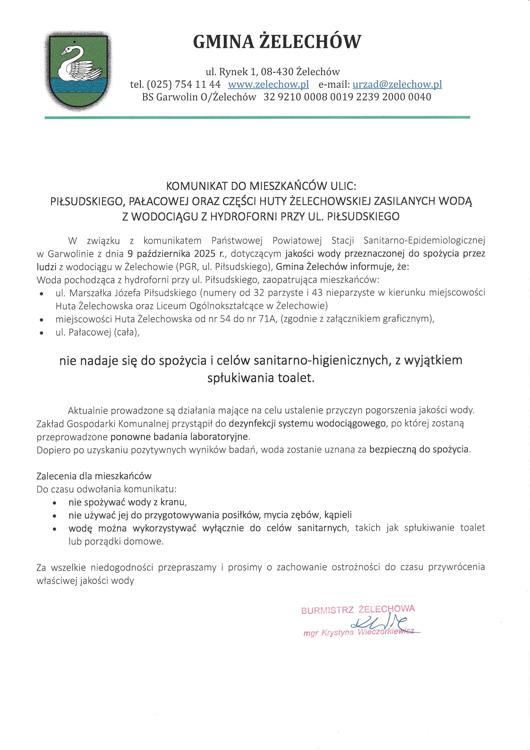 W związku z komunikatem Państwowej Powiatowej Stacji Sanitarno-Epidemiologicznej w Garwolinie z dnia 9 października 2025 r., dotyczącym jakości wody przeznaczonej do spożycia przez ludzi z wodociągu w Żelechowie (PGR, ul. Piłsudskiego), Gmina Żelechów informuje, że: