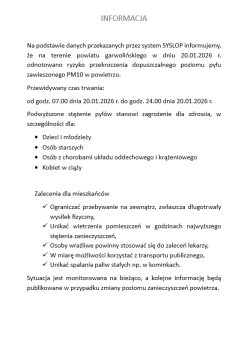 Powiadomienie o ryzyku wystąpienia przekroczenia poziomu pyłu zawieszonego PM10 w powietrzu Czytaj artykuł (lektor) Drukuj stronę Wyświetl stronę w formacie PDF 20 stycznia 2026
