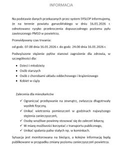 Powiadomienie o ryzyku wystąpienia przekroczenia poziomu pyłu zawieszonego PM10 w powietrzu Czytaj artykuł (lektor) Drukuj stronę Wyświetl stronę w formacie PDF 16 stycznia 2026 komunikat-gios (2)