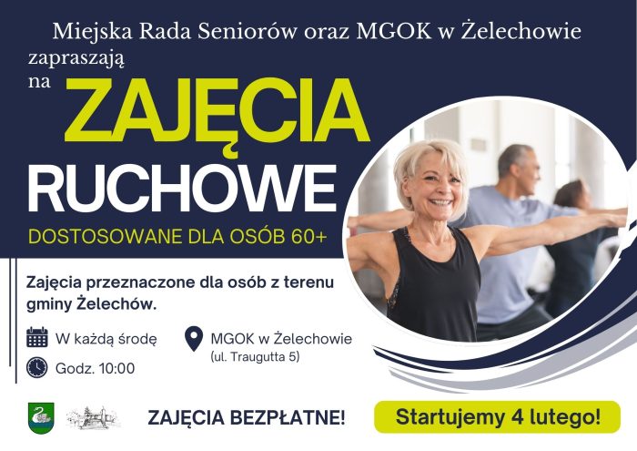 Miejska Rada Seniorów oraz MGOK w Żelechowie zapraszają na zajęcia ruchowe dostosowane dla osób 60+ z terenu gminy Żelechów. Zajęcia odbywać się będą w każdą środę o godz. 10.00 w sali widowiskowej MGOK. Start zajęć 4 lutego. Zajęcia są bezpłatne.